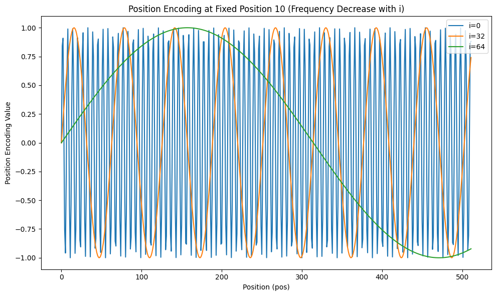 其中,pos表示 token 在序列中的位置,取值范围为[0, 1, 2, …, seq_len-1];i表示embedding的维度索引,范围为$[0, 1, …, d_{model}/2 - 1]$,i的所有取值总共有$d_{model}/2$个,每一个都分别通过施加sin或cos变换来对应某个token的embedding不同位置的偶数维与奇数维。