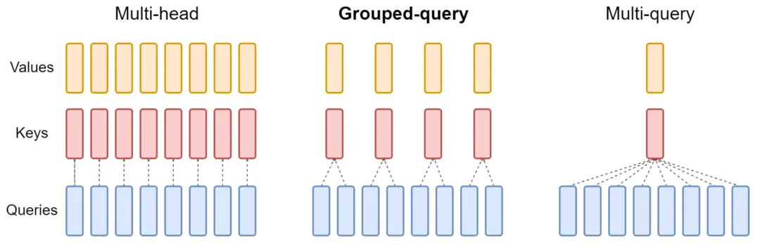 这张图清晰的展示了MHA,MQA和GQA的区别: